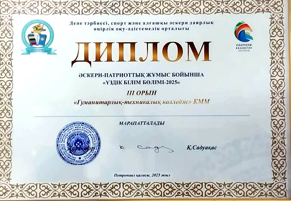 За достигнутые успехи в военно-спортивной работе Гуманитарно-технический колледж награжден Дипломом 3 степени. Преподаватель учебного заведения Литвиненко Татьяна Анатольевна получила Почетную грамоту Управления физической культуры и спорта акимата Северо-Казахстанской области за личный вклад в развитие спорта.